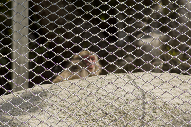 車道で遊んでいたの所を発見。すぐさま逃げたのですが、崖の上のフェンスすぐにいたので、車内から望遠レンズで撮影。ただ、手前のフェンスにピントが合ってるのが残念・・・。