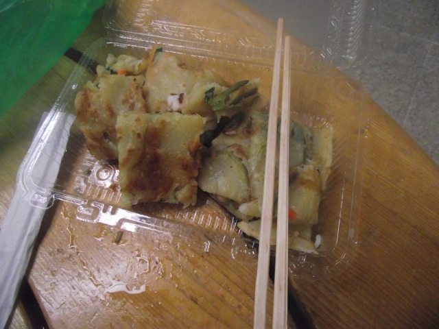 写真のチヂミは晩飯に買いました。シフトの人への差し入れ(何しろ、大雨でめちゃくちゃ寒くて、差し入れなしじゃキツイ・・・!)の分も併せて3パック注文したのですが、夕方行った時のお兄さんが俺の顔を覚えてて、サービスとして200円のおやきみたいなお菓子をくれました。これまた甘くておいしかったしw