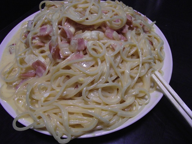 まず一品目。カルボナーラ。以前ブログに載せたのと全く同じ手法で作りました。結構好評だったのですが、俺は食べながら「何でうまいのに物足りへんのやろ?」と思っていたのもそのはず。生命線のブラックペッパーかけ忘れてた・・・!
