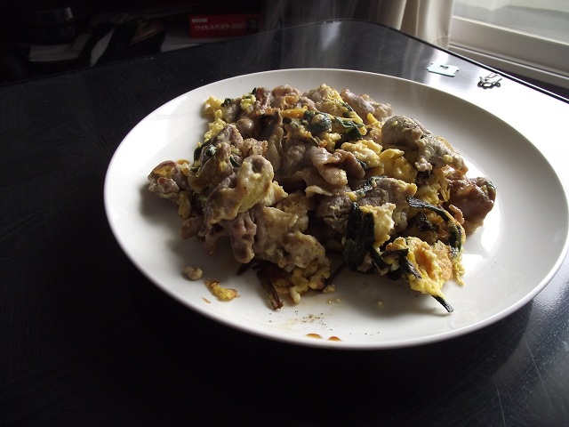 2.大きめのボウルに卵2つを溶いて、みじん切り(?)にしたスライスチーズ、黒コショウを投入し、良くかき混ぜる。この時、チーズもコショウも多めに入れるのがポイント。スライスチーズは3枚~5枚。3枚だとソースの味にチーズの風味があまり入らず、5枚以上になると、チーズが濃くなります。