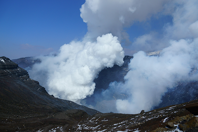 写真だと湯溜まりの火口写真が有名ですが、既に干上がっており、もくもくと上がる噴煙しか見れませんでした。