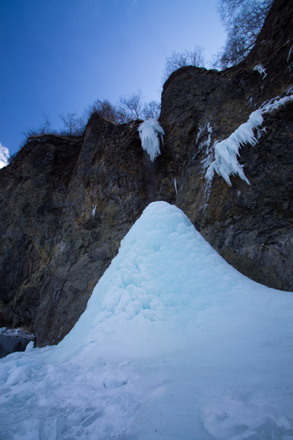 年中水量の少ない滝で、普段から空中に霧散してしまうほどの水量の滝ということもあるのか、滝壺から徐々に凍っていき、崖上からも凍っていくというまるで鍾乳石のような氷瀑でした。