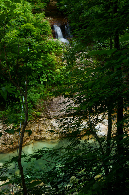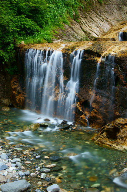 写真は日本の滝百選No.39の姥ヶ滝の遊歩道で撮った、小親谷の滝。