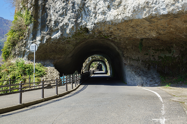 この青の洞門、約300年前に禅海という和尚が石工を雇って槌とノミのみで掘ったトンネルです。現在は一部しか当時のものは残っていませんが、この断崖絶壁を貫通する通路は驚きの一言です。