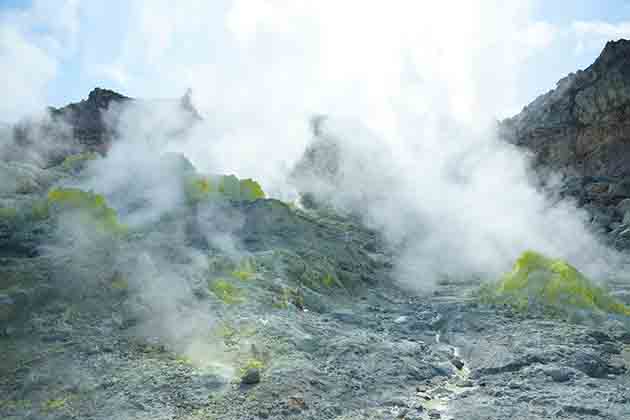 何十年か前まで硫黄を実際に採掘していた山ということもあり、ものすごく大きい硫黄の結晶が普通に見れる火山。