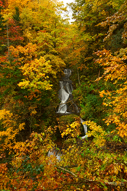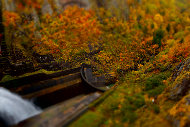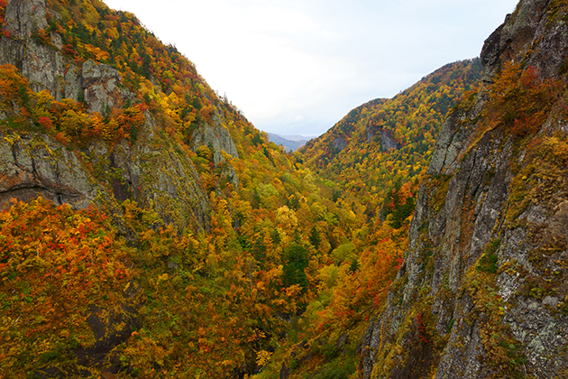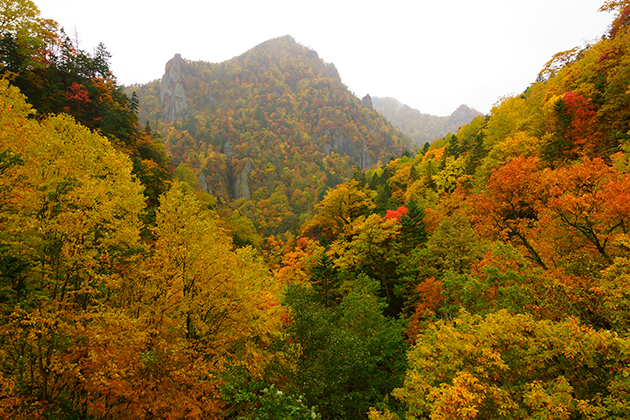 紅葉が黄色メインのせいで壮大さが薄れている感がありますが、断崖絶壁と紅葉の見事なコラボ。