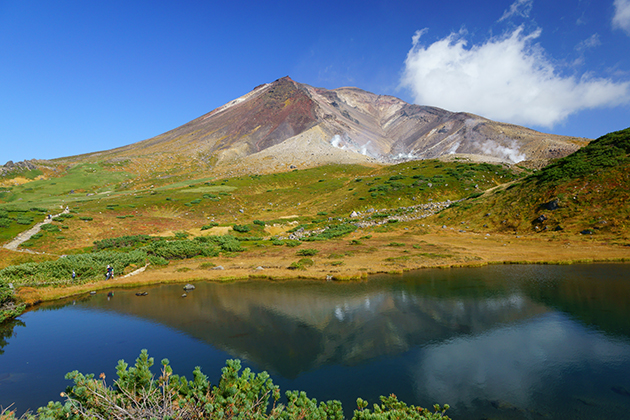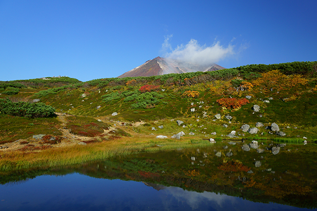 しかし、頑張って歩いたわりに、撮った写真で気に入ってるのは、ロープウェイ駅から近い、夫婦池と姿見の池と共に撮った旭岳。